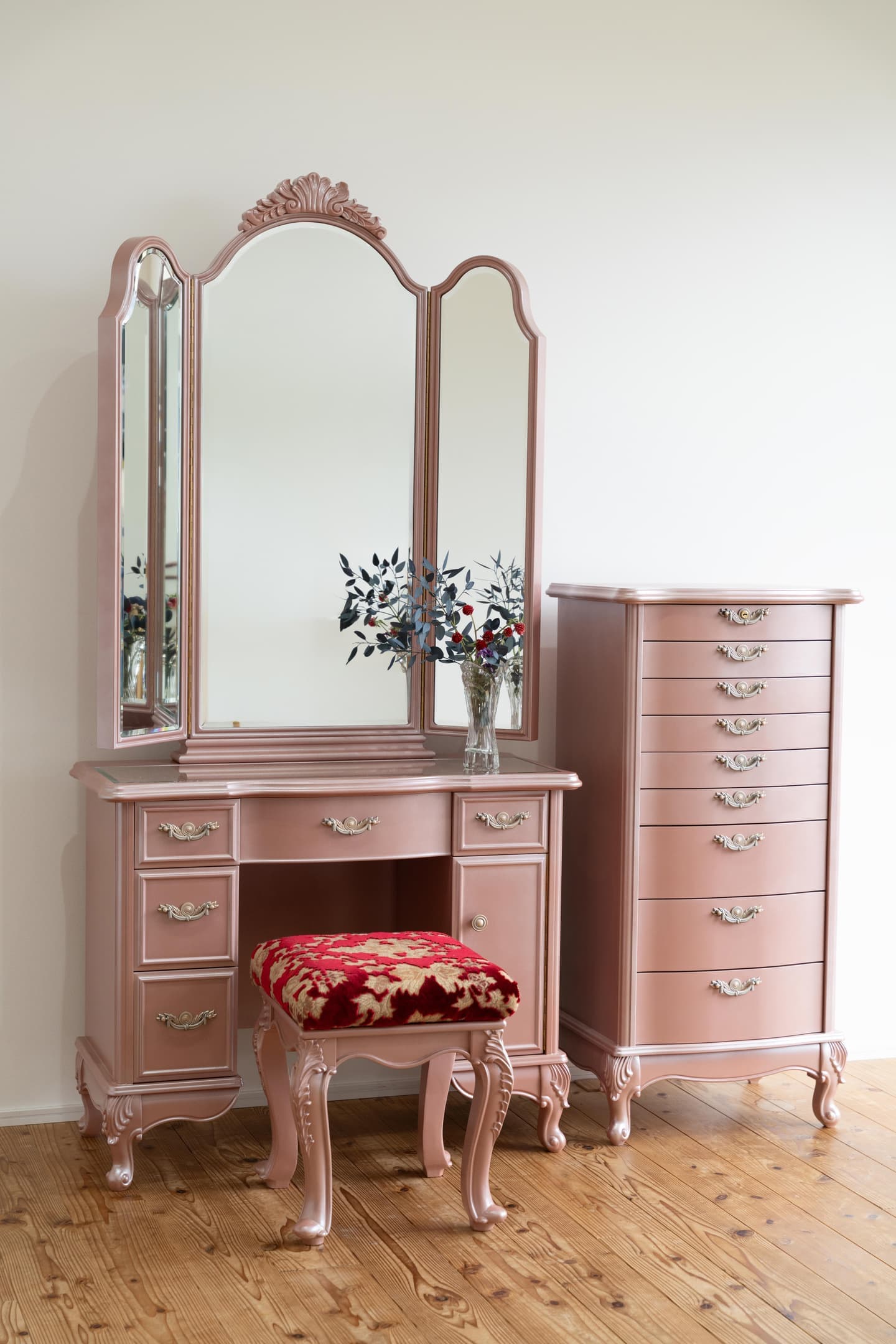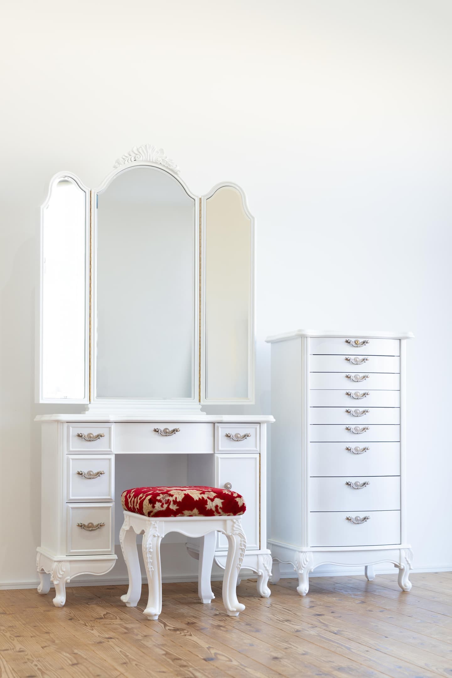 鏡台本体 + 専用椅子 + チェストの3点セット構成。