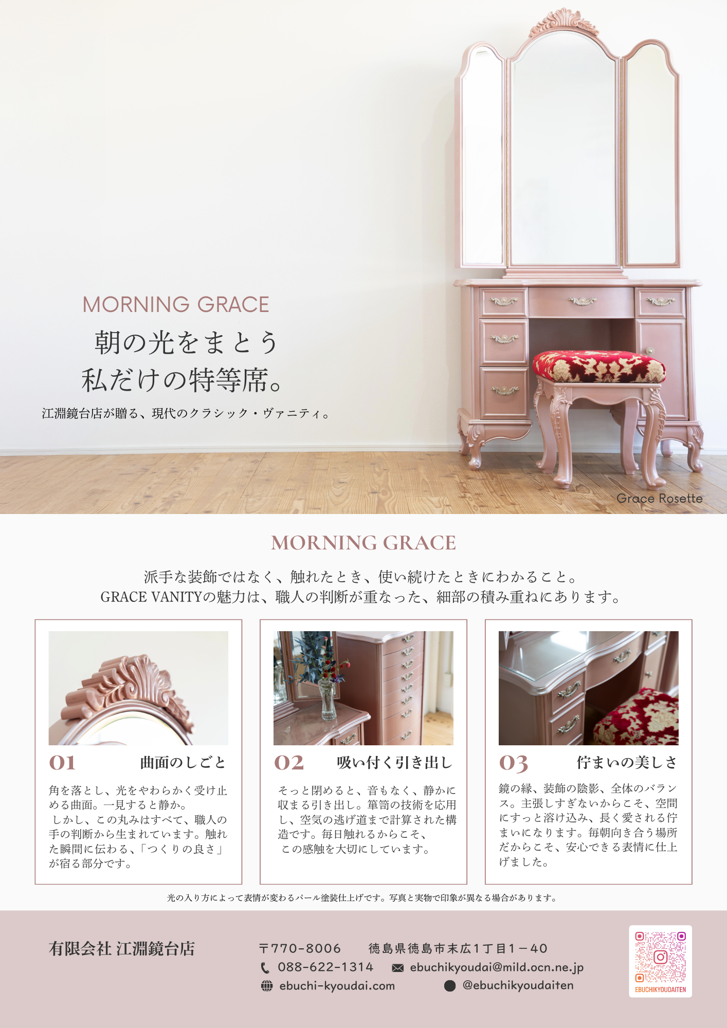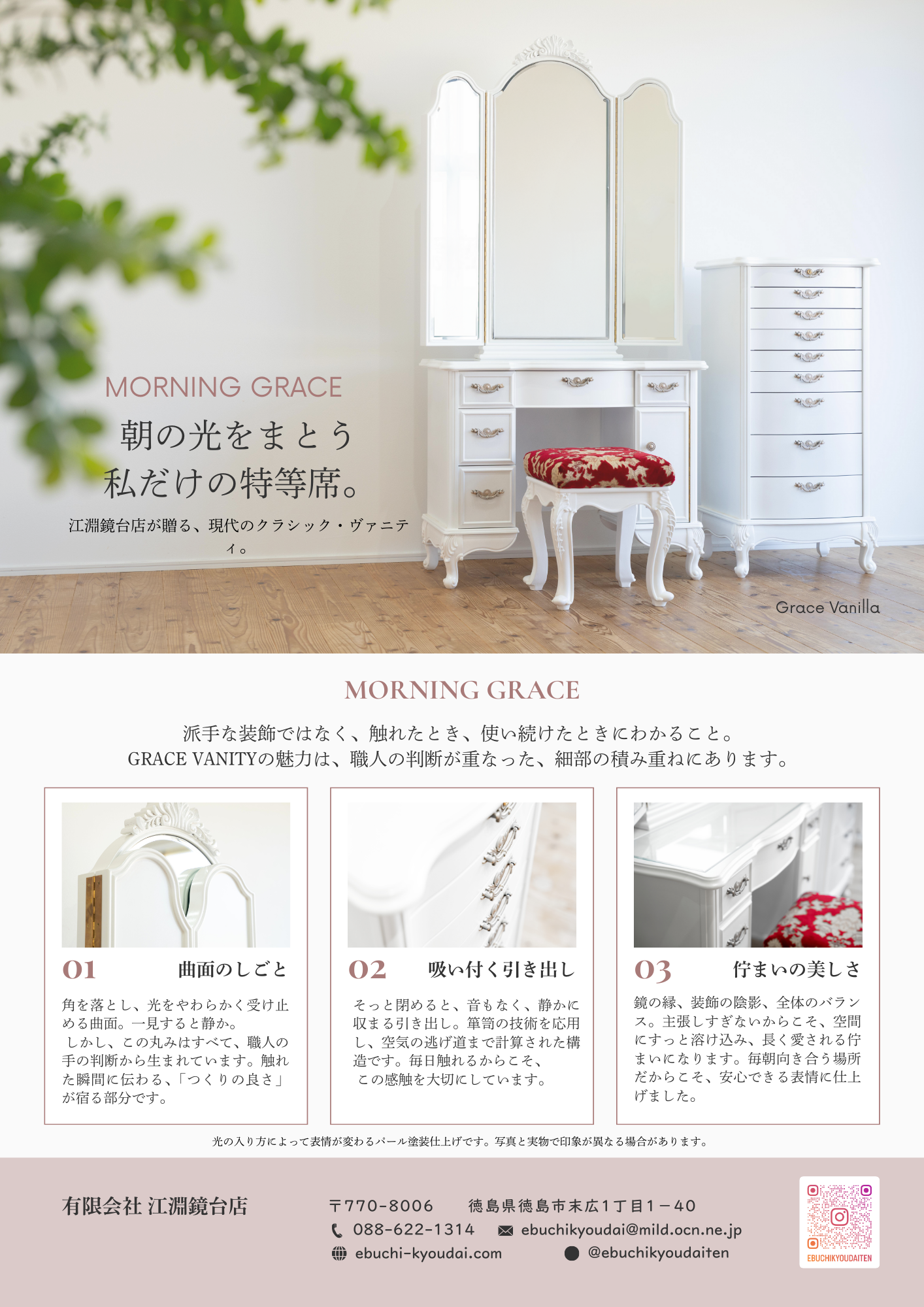 鏡台と揃えて使うことで、朝の支度空間がより一層、統一感のある美しい佇まいに。小さな宝物を、美しく守る。江淵鏡台店の技術が息づく、もうひとつのGraceです。